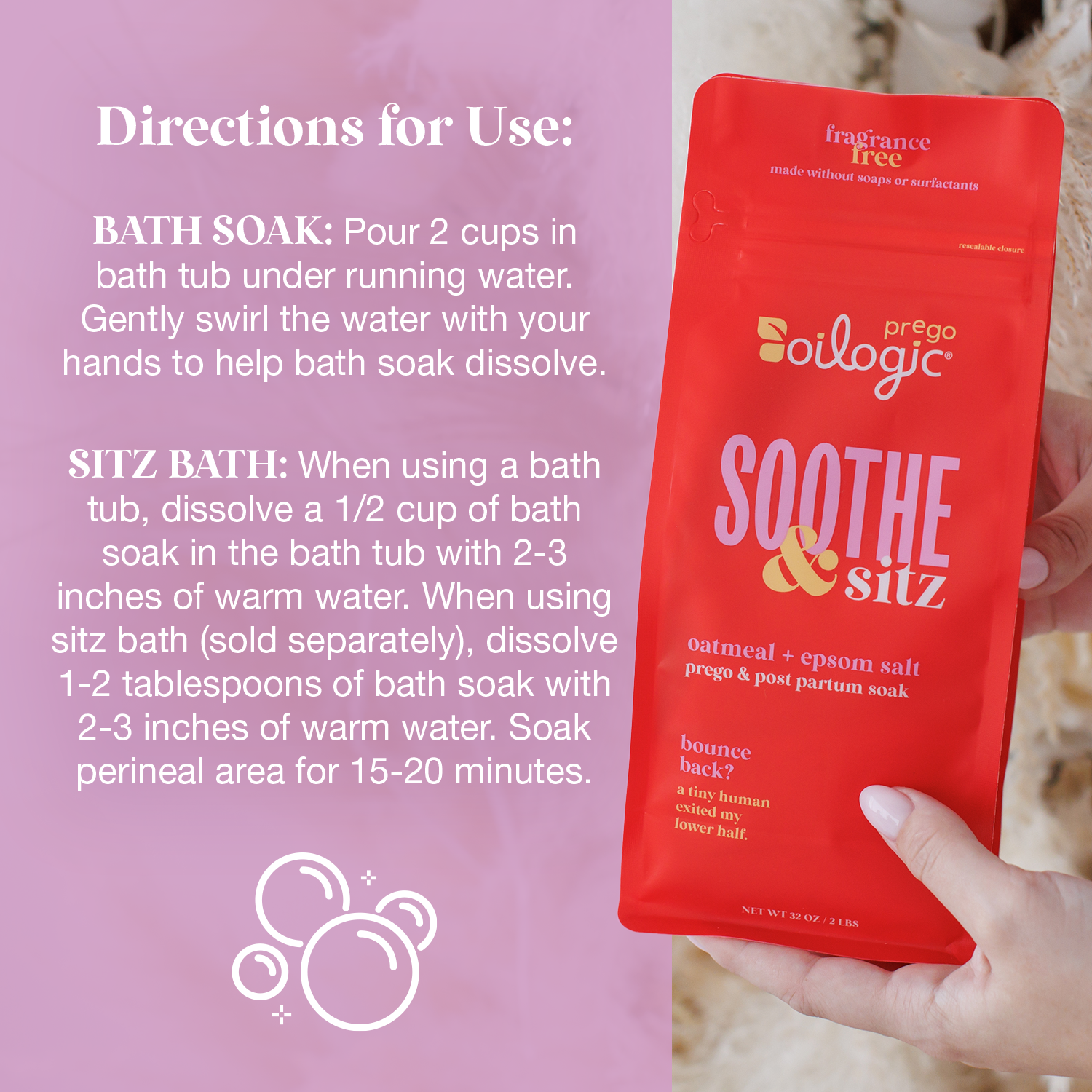 SITZ BATH: When using bathtub, dissolve a 1/2 cup of soak in the bathtub with 2-3 inches of warm water. When using a sitz bath (plastic basin sold separately); dissolve 1-2 tablespoons of bath soak in the sitz bath with 2-3 inches of warm water. Simply soak the perineal area for 15-20 minutes in a warm sitz bath.